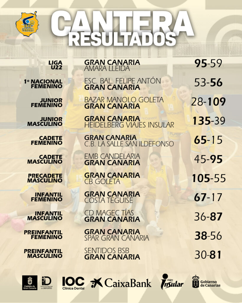 El U22 abría el fin de semana con su cuarta victoria consecutiva en liga. Después de un partido en el que consiguieron dominar desde el principio, los amarillos sumaron un importante triunfo ante Amara Lleida por 95-59. Asimismo, el Gran Canaria ULPGC venció en la pista de Escuela de Baloncesto Felipe Antón por un ajustado 53-56. Por su parte, los dos equipos junior lograron contundentes victorias en sus respectivos encuentros. El masculino ganó a Heildelberg Viajes Insular por 135-39, mientras que el femenino visitó el feudo de Bazar Manolo Goleta, en un encuentro en el que las amarillas vencieron por 28-109.